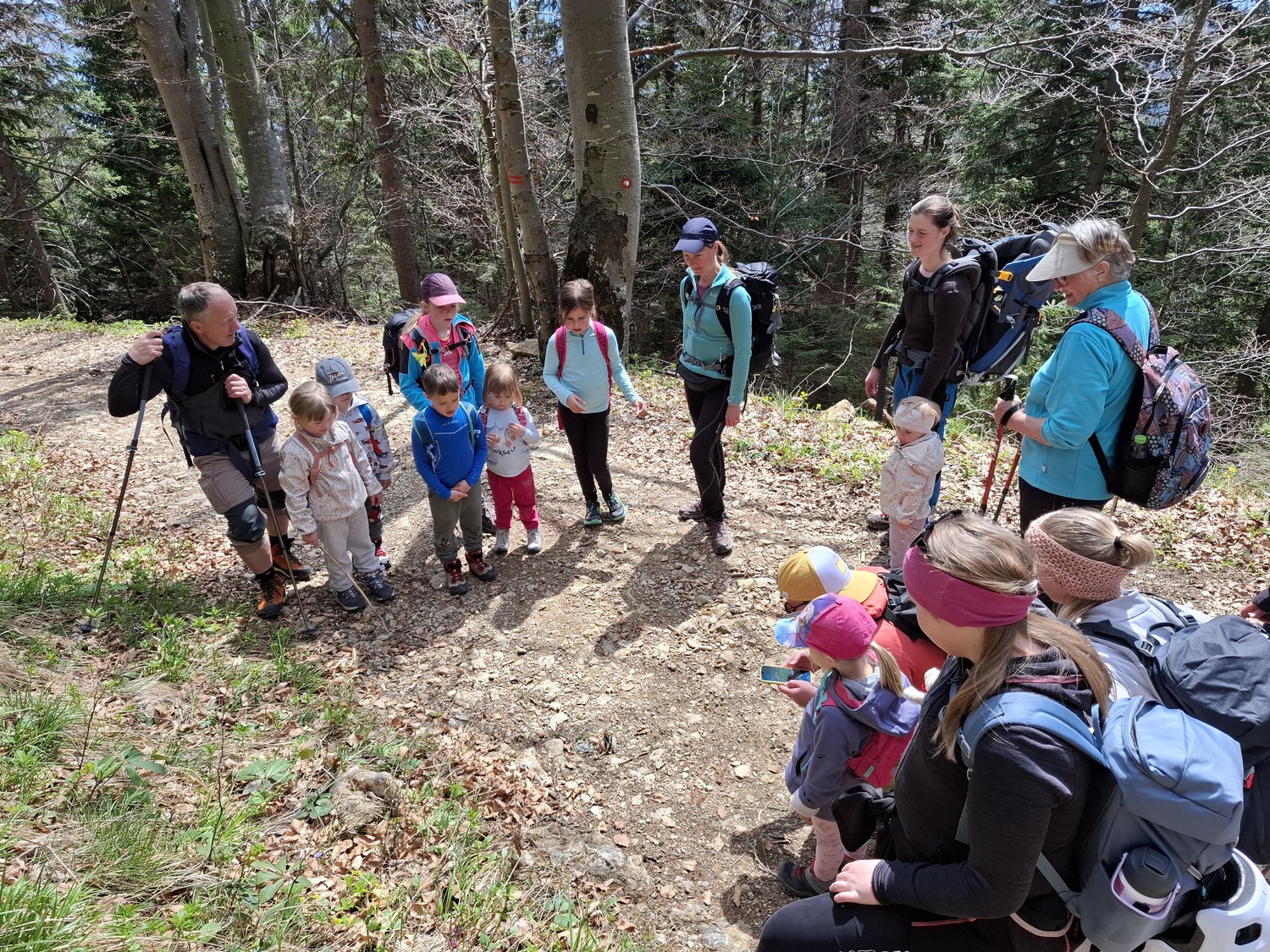 S svojimi avtomobili smo se peljali na Ston. Od tam smo po gozdnih vlakah do izvira Trnave hodili tako zagnano, da nam je čas kar prehitro minil. Po prvi malici smo se razdelili v dve skupini: lažja pot je vodila po cesti, težja pa po ozki stezici pod Alpskim vrtom. Na Mozirski koči smo se okrepčali, spočili, našli smo tudi še nekaj snega. Potem smo se do avtomobilov vrnili preko razgledne Goličke loke, kjer smo srečali močerada in (skoraj vsi) splezali na idilično lovsko prežo. Hvala vsem udeležencem za zabavno družbo ter vodnikoma Jani Pahovnik in Zdeniju Purnatu za varno spremstvo. Takšne zagnane male (in velike) pohodnike čaka še veliko planinskih poti!