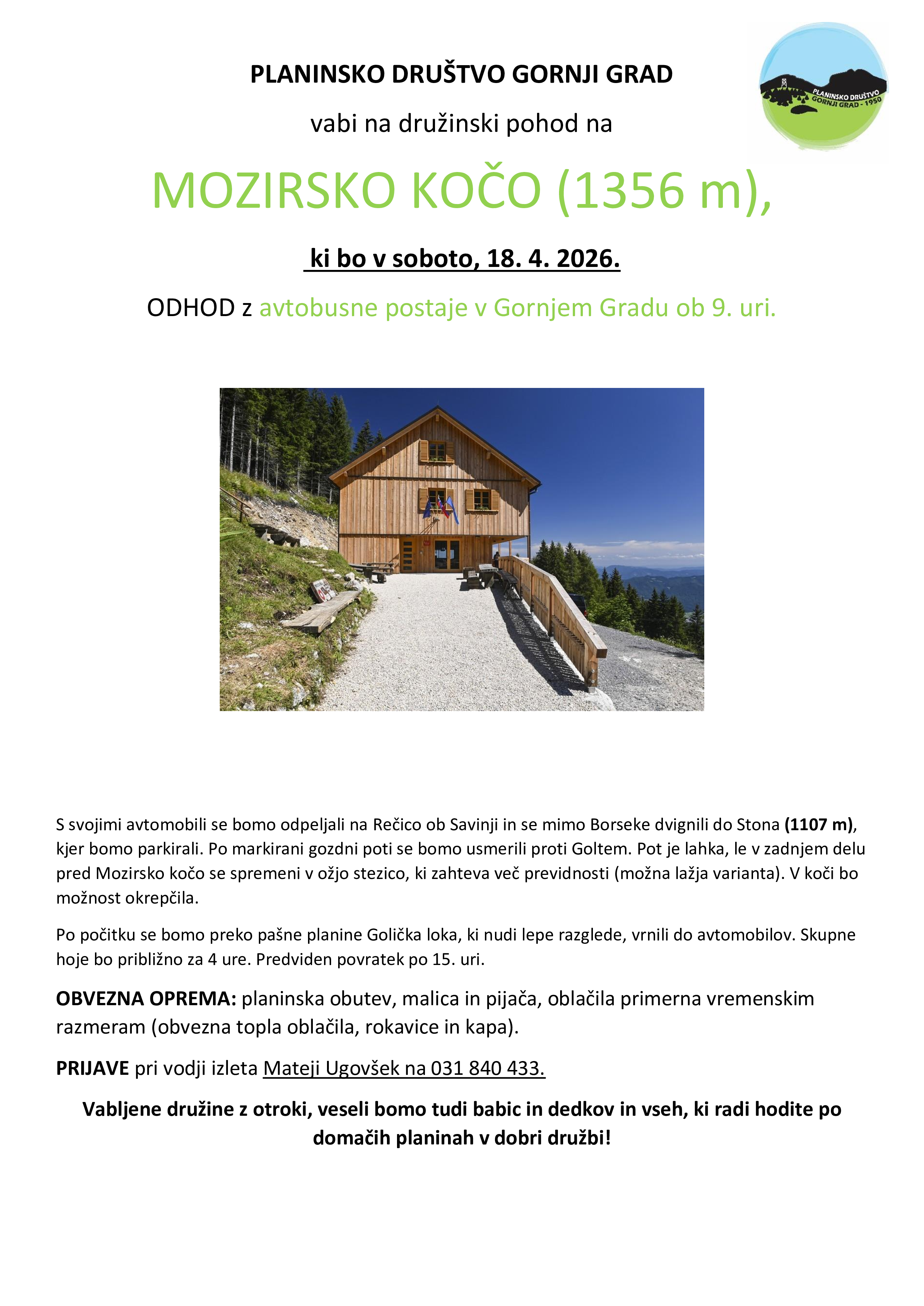 Vabljeni na družinski pohod na Mozirsko kočo (1356 m), ki bo v soboto, 18. 4. 2026. Odhod z avtobusne postaje v Gornjem Gradu ob 9. uri.